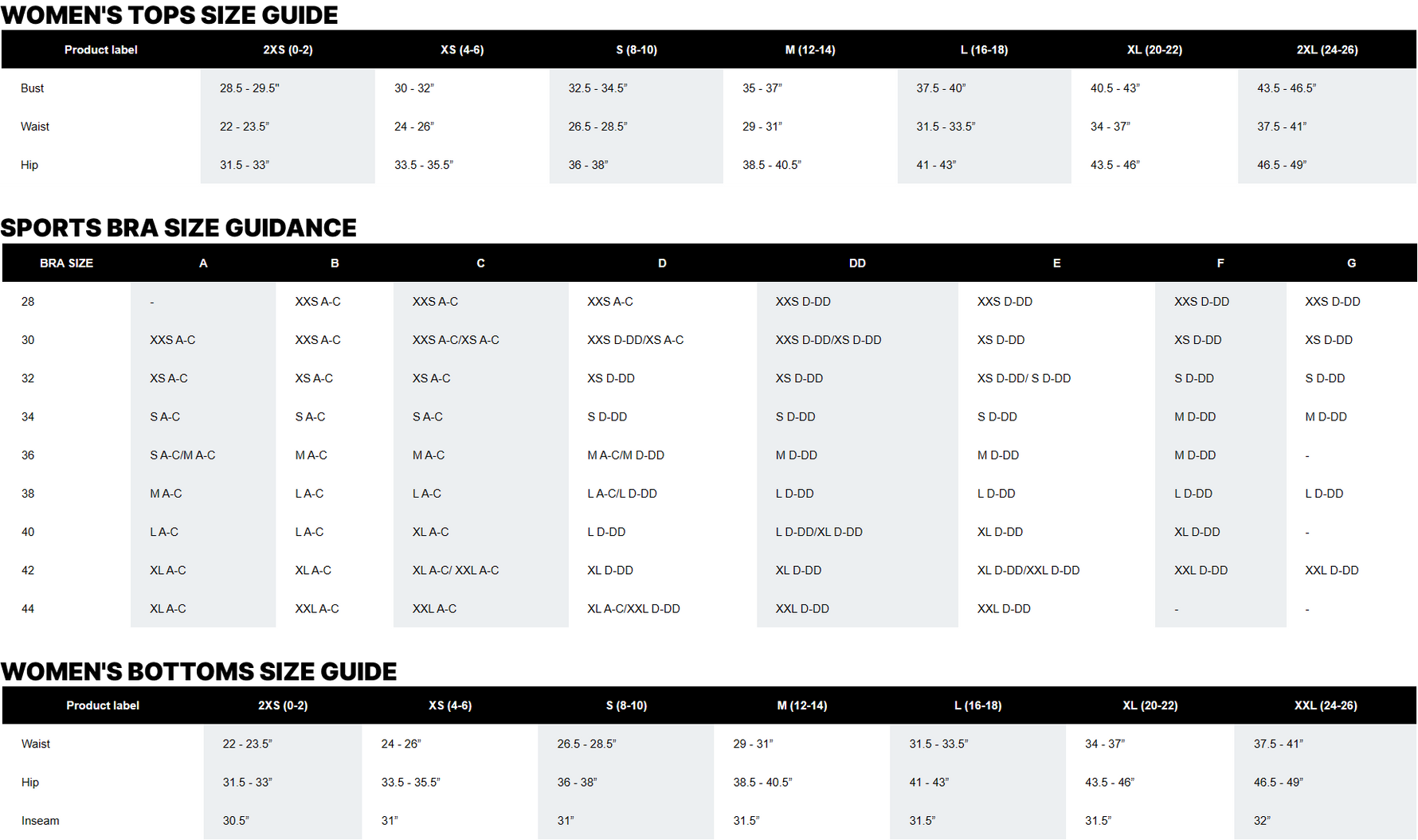 Product Label | 2XS (0-2) | XS (4-6) | S (8-10) | M (12-14) | L (16-18) | XL (20-22) | 2XL (24-26) |
